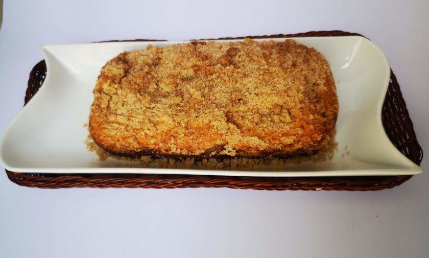 Suave panqué de vainilla con una capa de canela y topping de streusel.